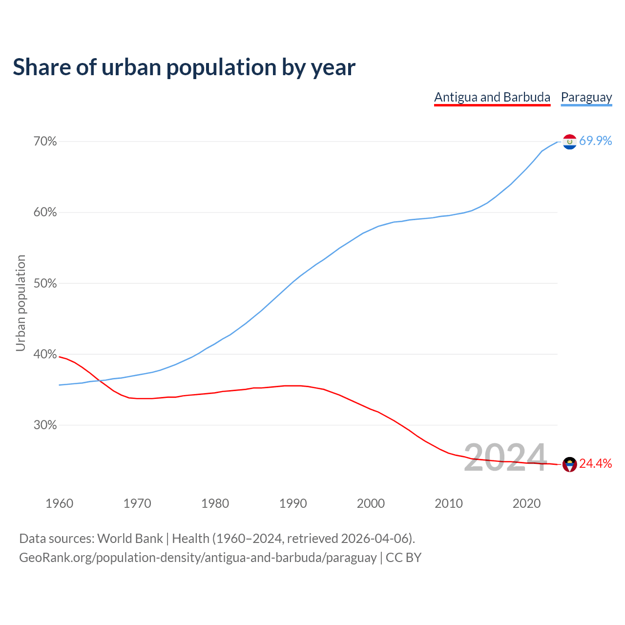 From 2004 to 2024, the share of urban population changed from 29.9% to 24.4% in Antigua and Barbuda and from 58.7% to 69.9% in Paraguay.