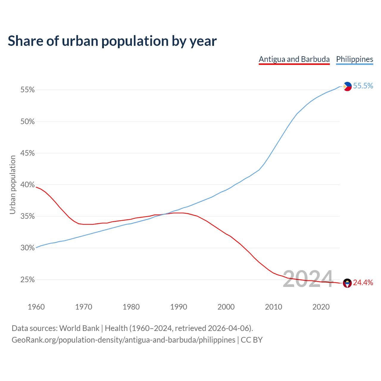 From 2004 to 2024, the share of urban population changed from 29.9% to 24.4% in Antigua and Barbuda and from 40.9% to 55.5% in the Philippines.