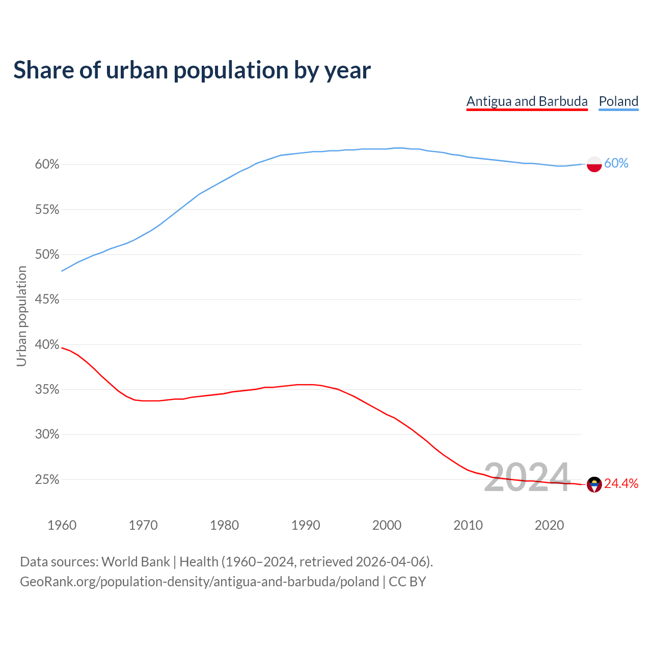 From 2004 to 2024, the share of urban population changed from 29.9% to 24.4% in Antigua and Barbuda and from 61.7% to 60% in Poland.