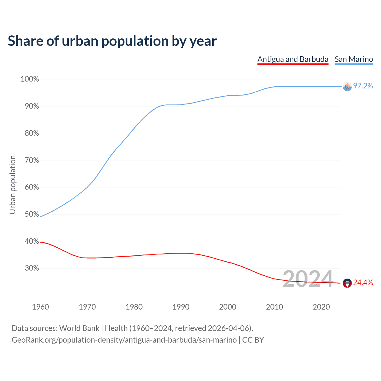 From 2004 to 2024, the share of urban population changed from 29.9% to 24.4% in Antigua and Barbuda and from 94.2% to 97.2% in San Marino.