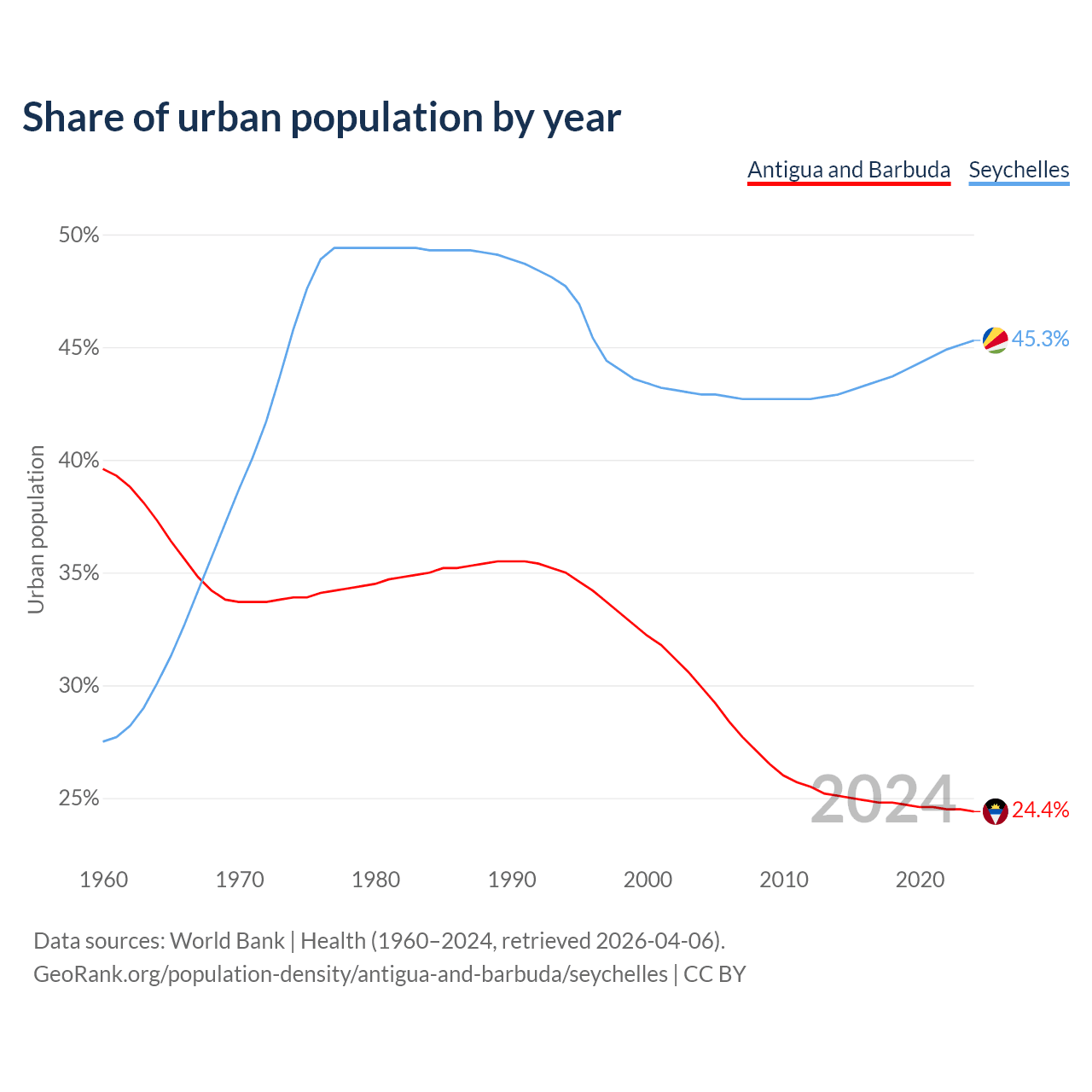 From 2004 to 2024, the share of urban population changed from 29.9% to 24.4% in Antigua and Barbuda and from 42.9% to 45.3% in the Seychelles.