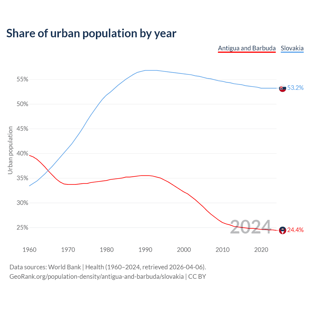 From 2004 to 2024, the share of urban population changed from 29.9% to 24.4% in Antigua and Barbuda and from 55.6% to 53.2% in Slovakia.