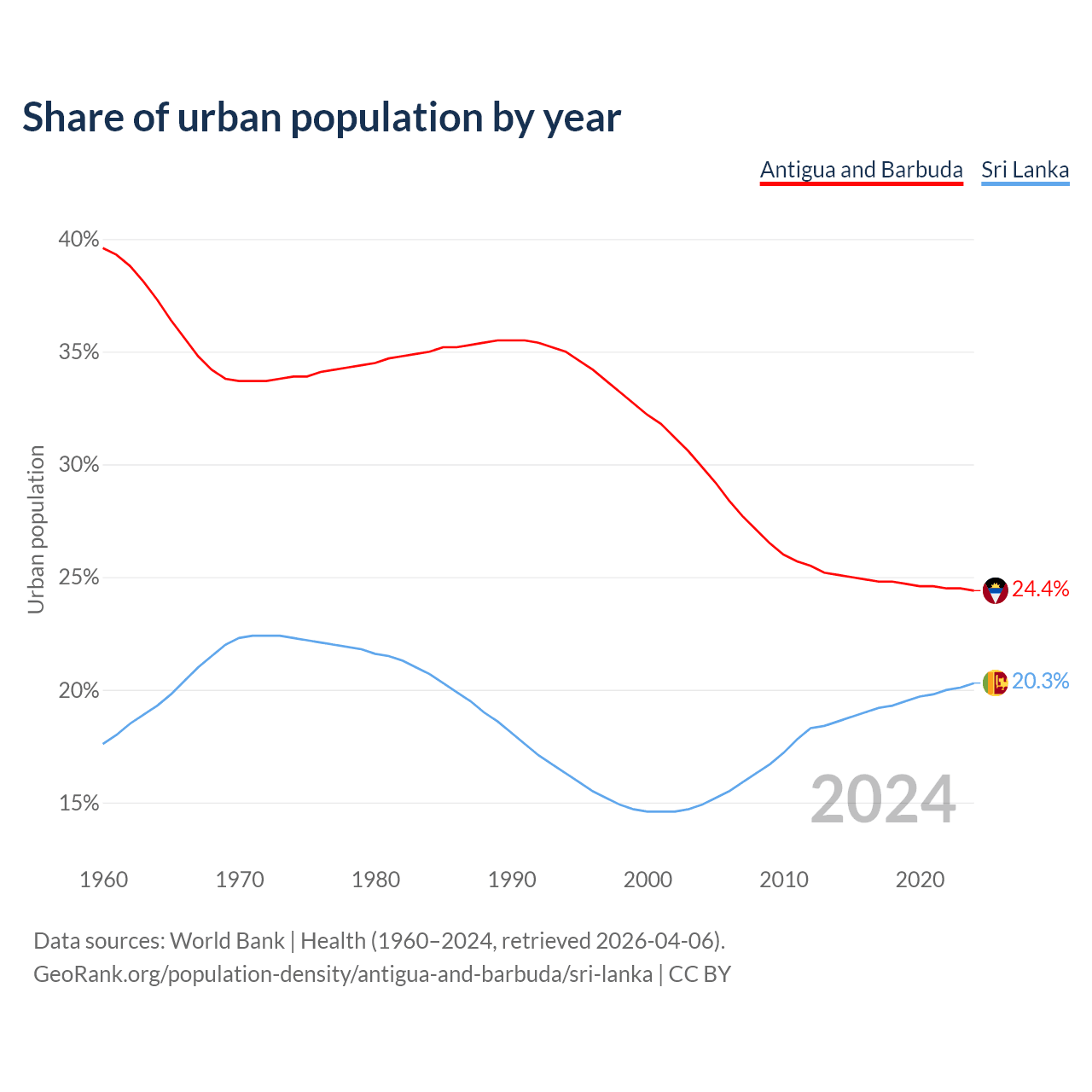 From 2004 to 2024, the share of urban population changed from 29.9% to 24.4% in Antigua and Barbuda and from 14.9% to 20.3% in Sri Lanka.