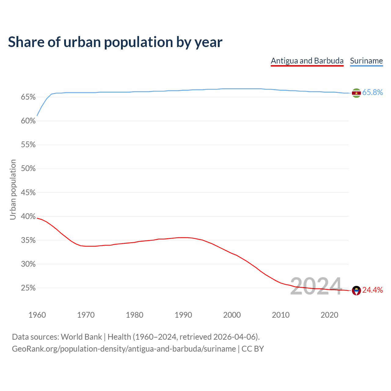 From 2004 to 2024, the share of urban population changed from 29.9% to 24.4% in Antigua and Barbuda and from 66.7% to 65.8% in Suriname.