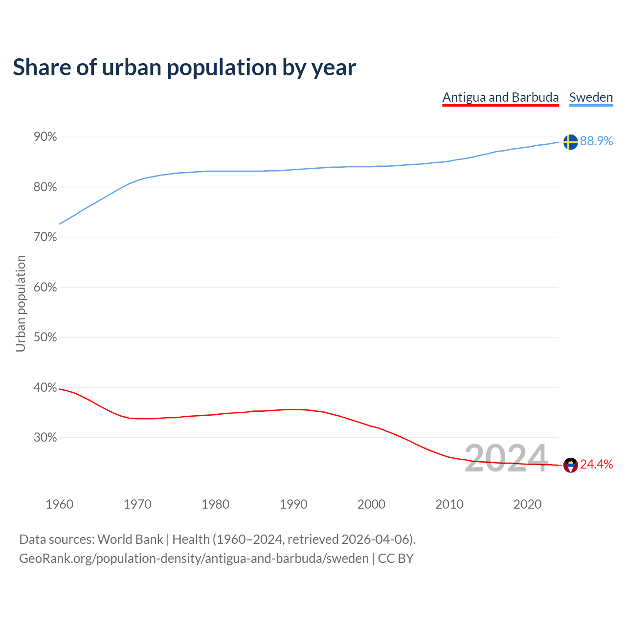 From 2004 to 2024, the share of urban population changed from 29.9% to 24.4% in Antigua and Barbuda and from 84.3% to 88.9% in Sweden.