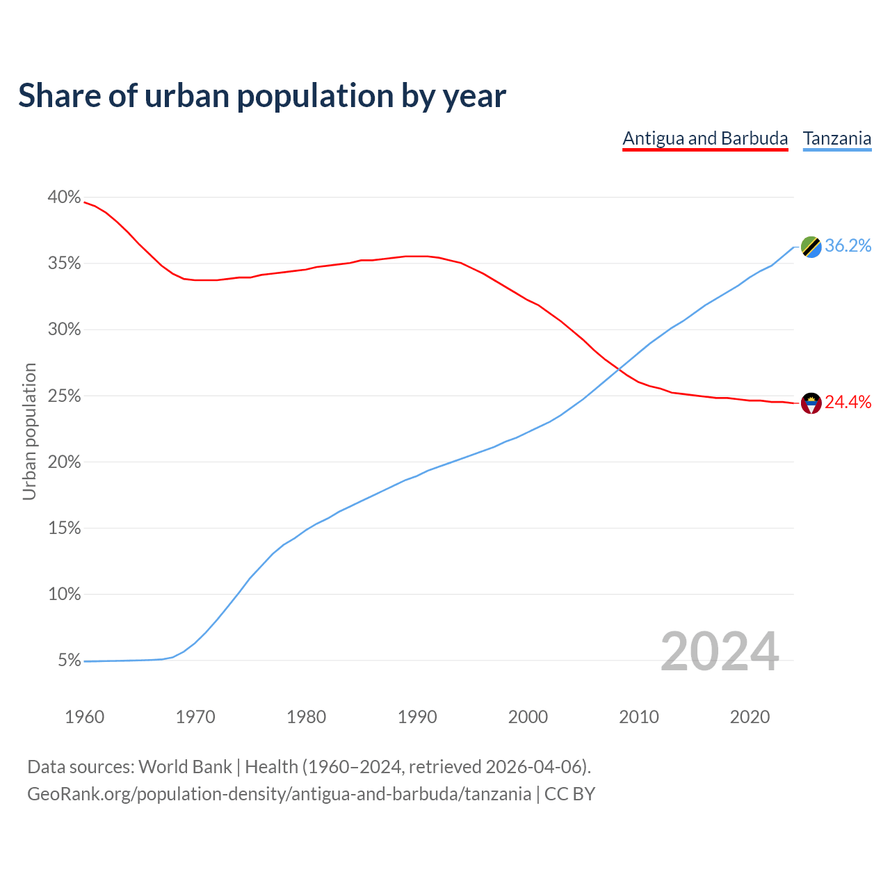 From 2004 to 2024, the share of urban population changed from 29.9% to 24.4% in Antigua and Barbuda and from 24.1% to 36.2% in Tanzania.