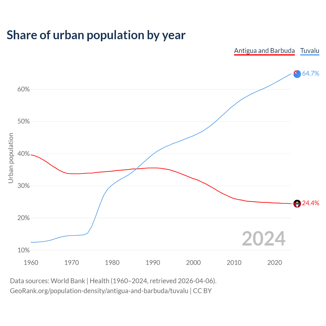 From 2004 to 2024, the share of urban population changed from 29.9% to 24.4% in Antigua and Barbuda and from 48.4% to 64.7% in Tuvalu.
