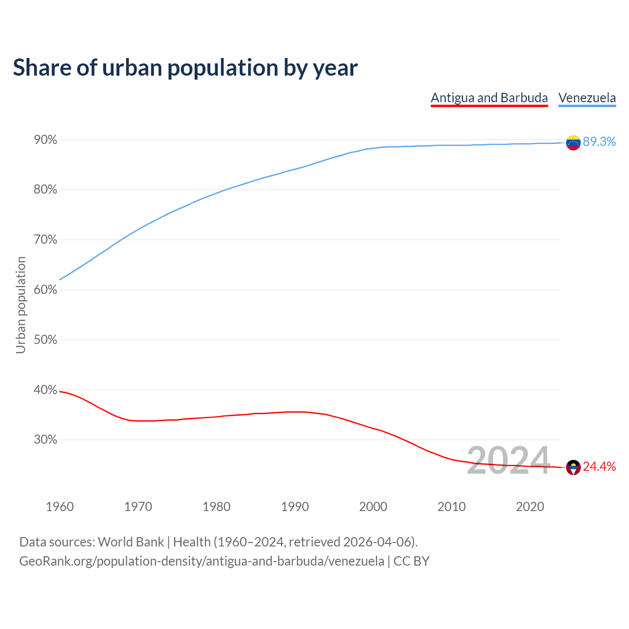 From 2004 to 2024, the share of urban population changed from 29.9% to 24.4% in Antigua and Barbuda and from 88.6% to 89.3% in Venezuela.