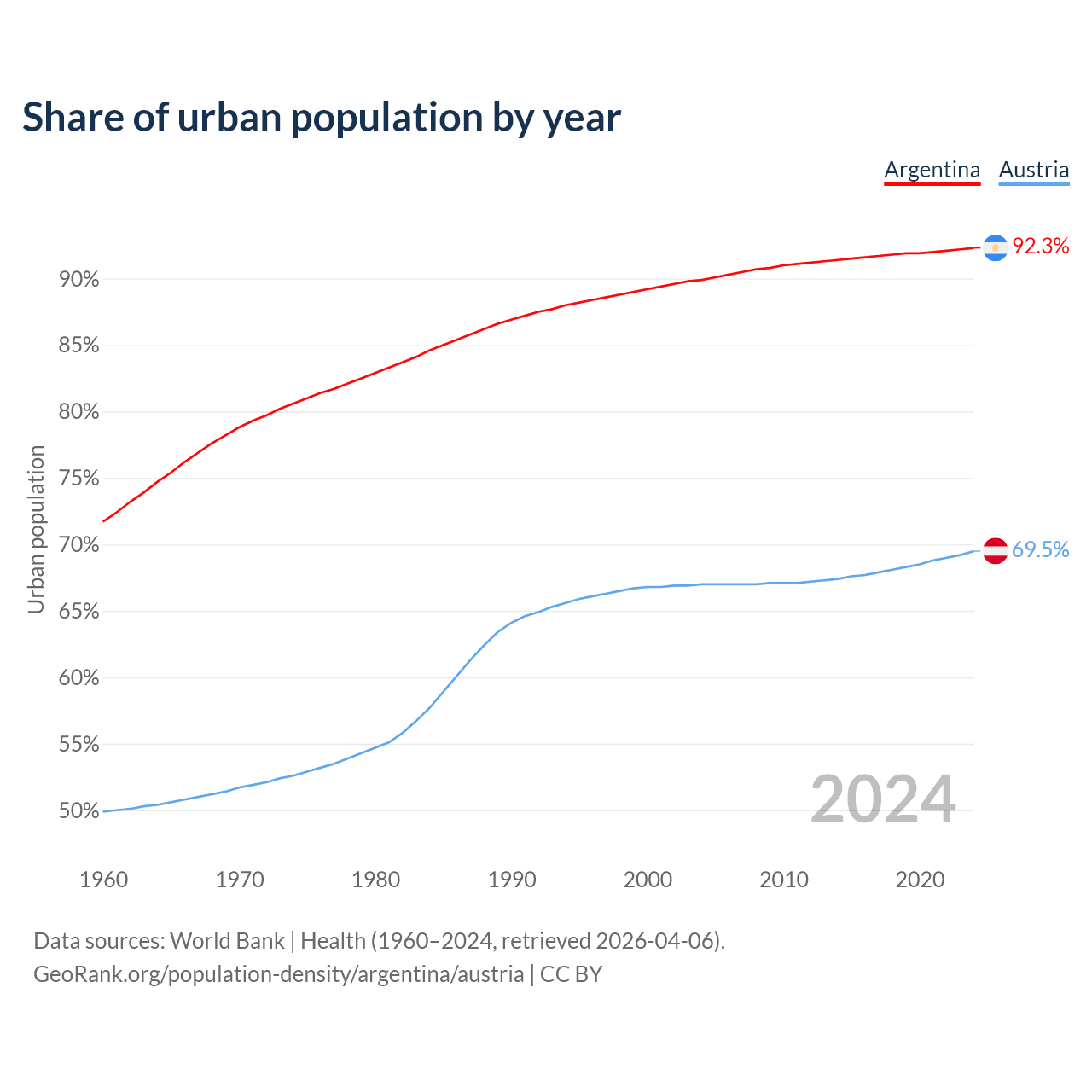 From 2004 to 2024, the share of urban population changed from 89.9% to 92.3% in Argentina and from 67% to 69.5% in Austria.