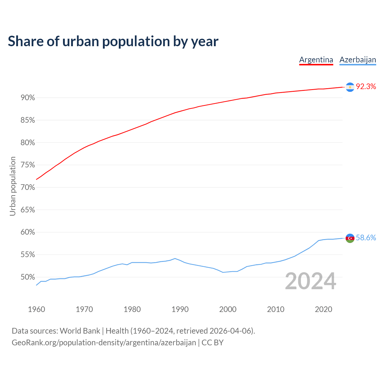 From 2004 to 2024, the share of urban population changed from 89.9% to 92.3% in Argentina and from 52.3% to 58.6% in Azerbaijan.