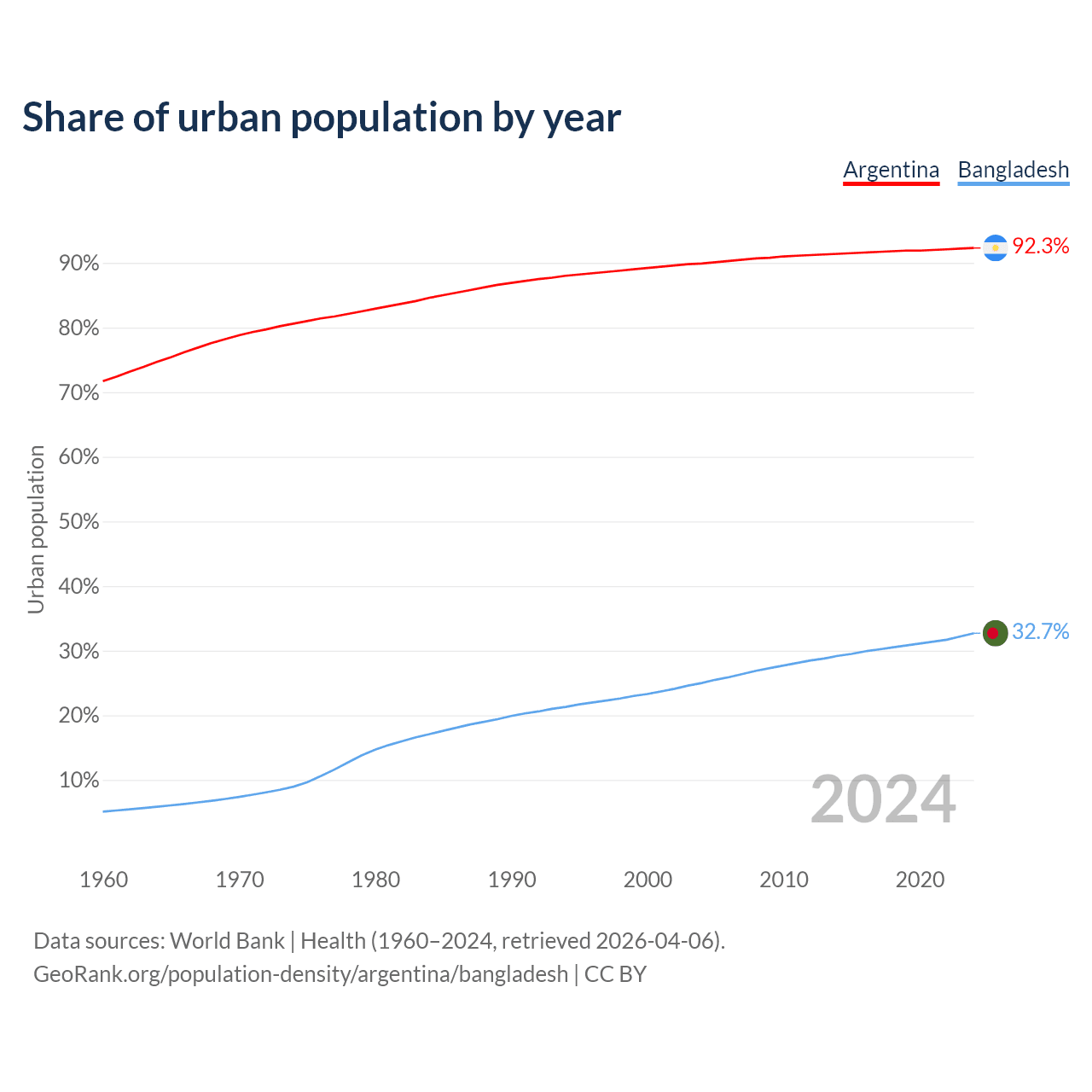 From 2004 to 2024, the share of urban population changed from 89.9% to 92.3% in Argentina and from 25% to 32.7% in Bangladesh.