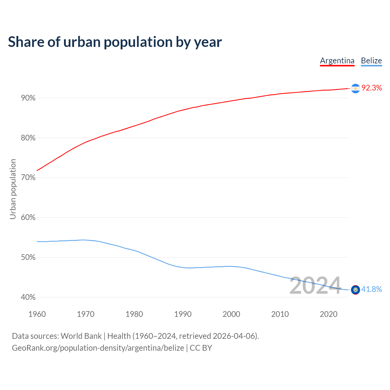 From 2004 to 2024, the share of urban population changed from 89.9% to 92.3% in Argentina and from 47% to 41.8% in Belize.