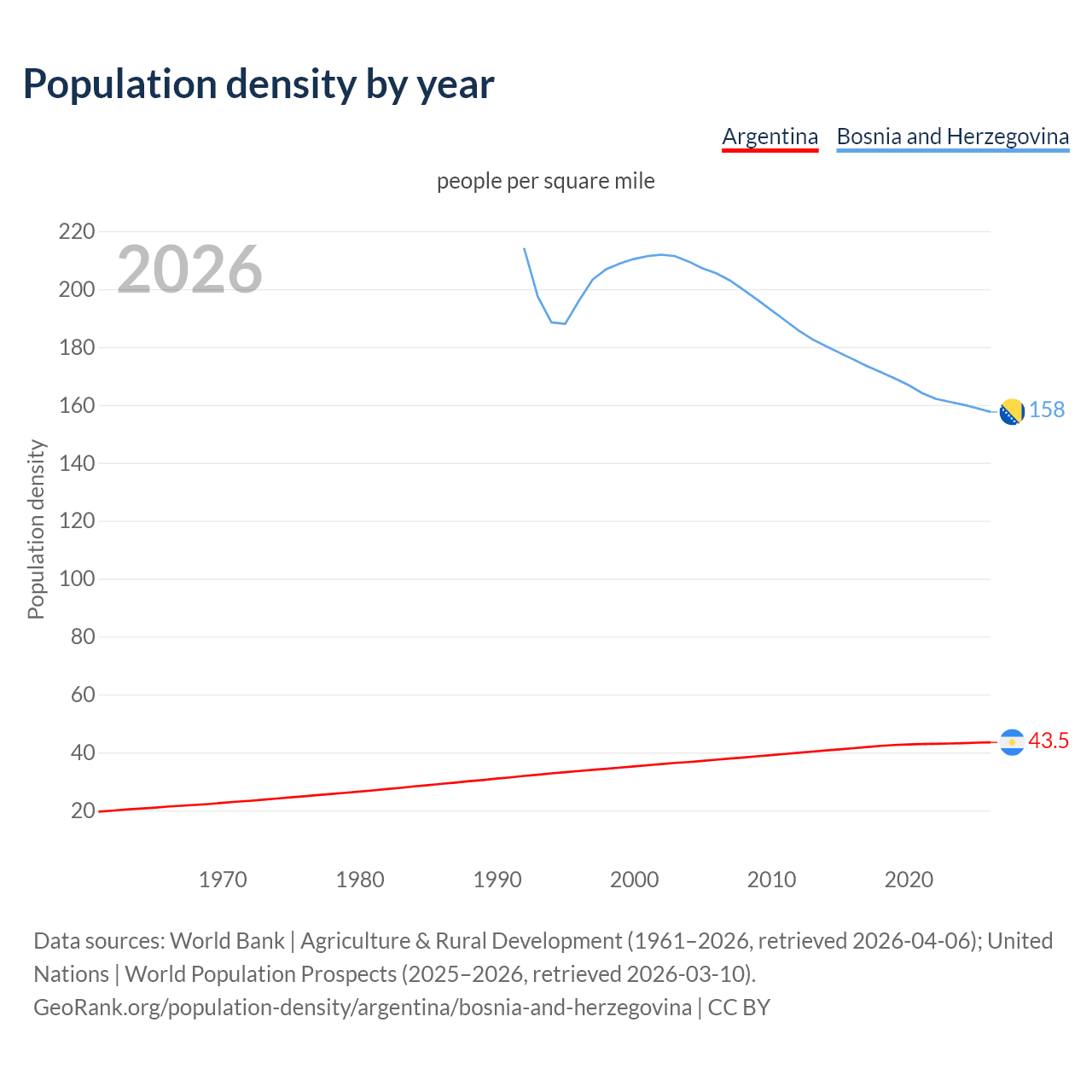From 2006 to 2026, population density in Argentina increased by 16.1%, compared to a 23.3% decline in Bosnia and Herzegovina.