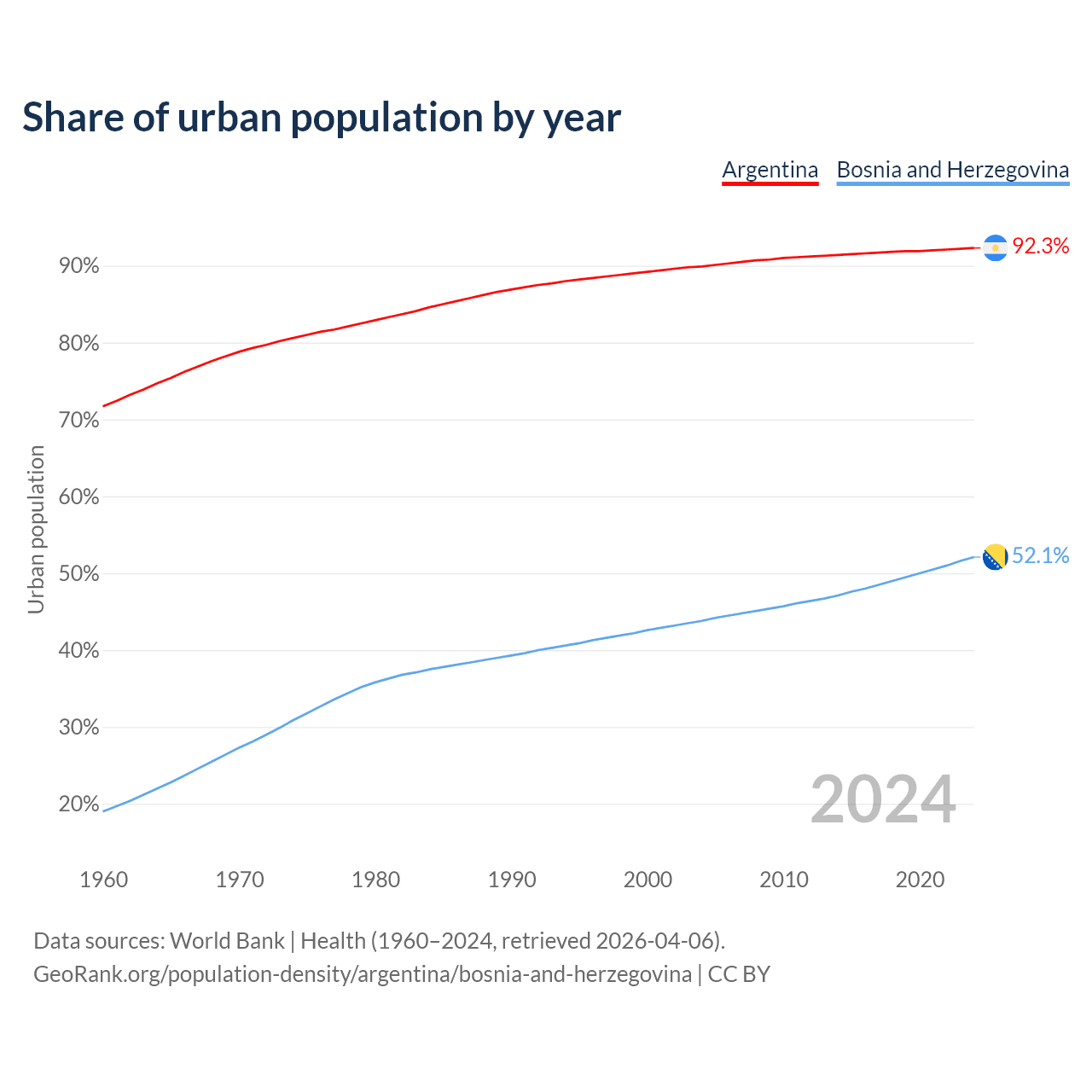 From 2004 to 2024, the share of urban population changed from 89.9% to 92.3% in Argentina and from 43.8% to 52.1% in Bosnia and Herzegovina.