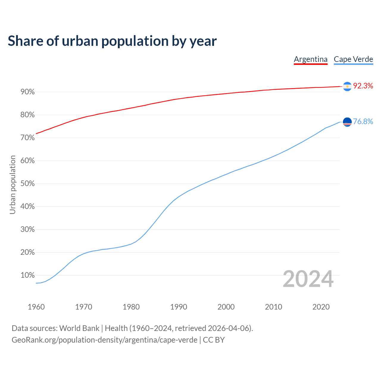 From 2004 to 2024, the share of urban population changed from 89.9% to 92.3% in Argentina and from 57.1% to 76.8% in Cape Verde.