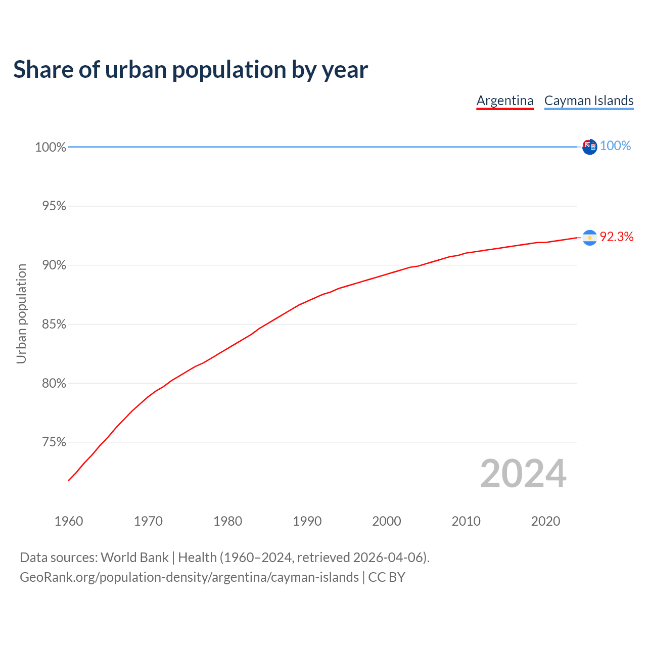 From 2004 to 2024, the share of urban population changed from 89.9% to 92.3% in Argentina and from 100% to 100% in the Cayman Islands.
