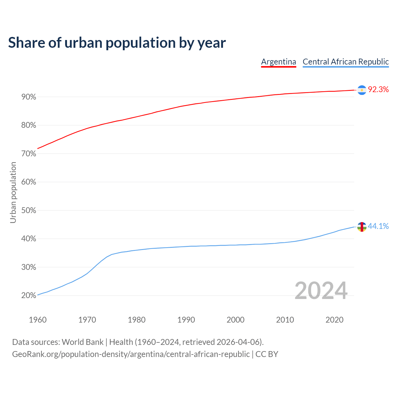 From 2004 to 2024, the share of urban population changed from 89.9% to 92.3% in Argentina and from 38% to 44.1% in the Central African Republic.
