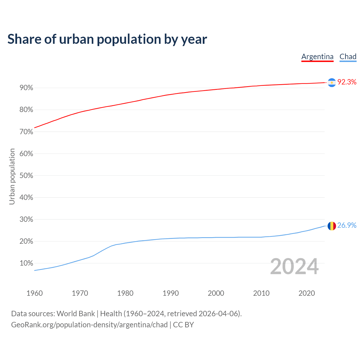 From 2004 to 2024, the share of urban population changed from 89.9% to 92.3% in Argentina and from 21.7% to 26.9% in Chad.