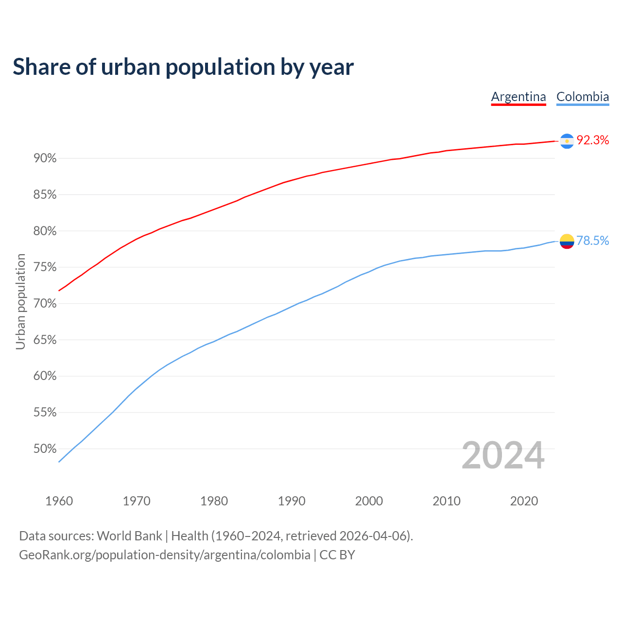 From 2004 to 2024, the share of urban population changed from 89.9% to 92.3% in Argentina and from 75.8% to 78.5% in Colombia.