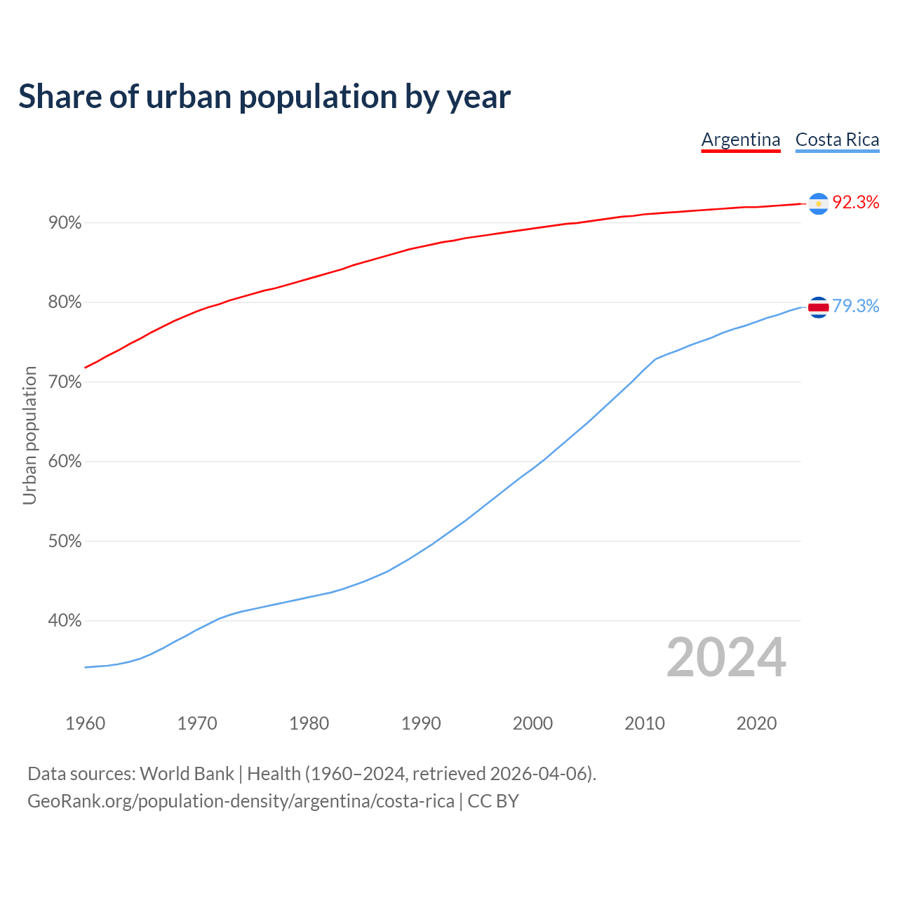 From 2004 to 2024, the share of urban population changed from 89.9% to 92.3% in Argentina and from 63.7% to 79.3% in Costa Rica.