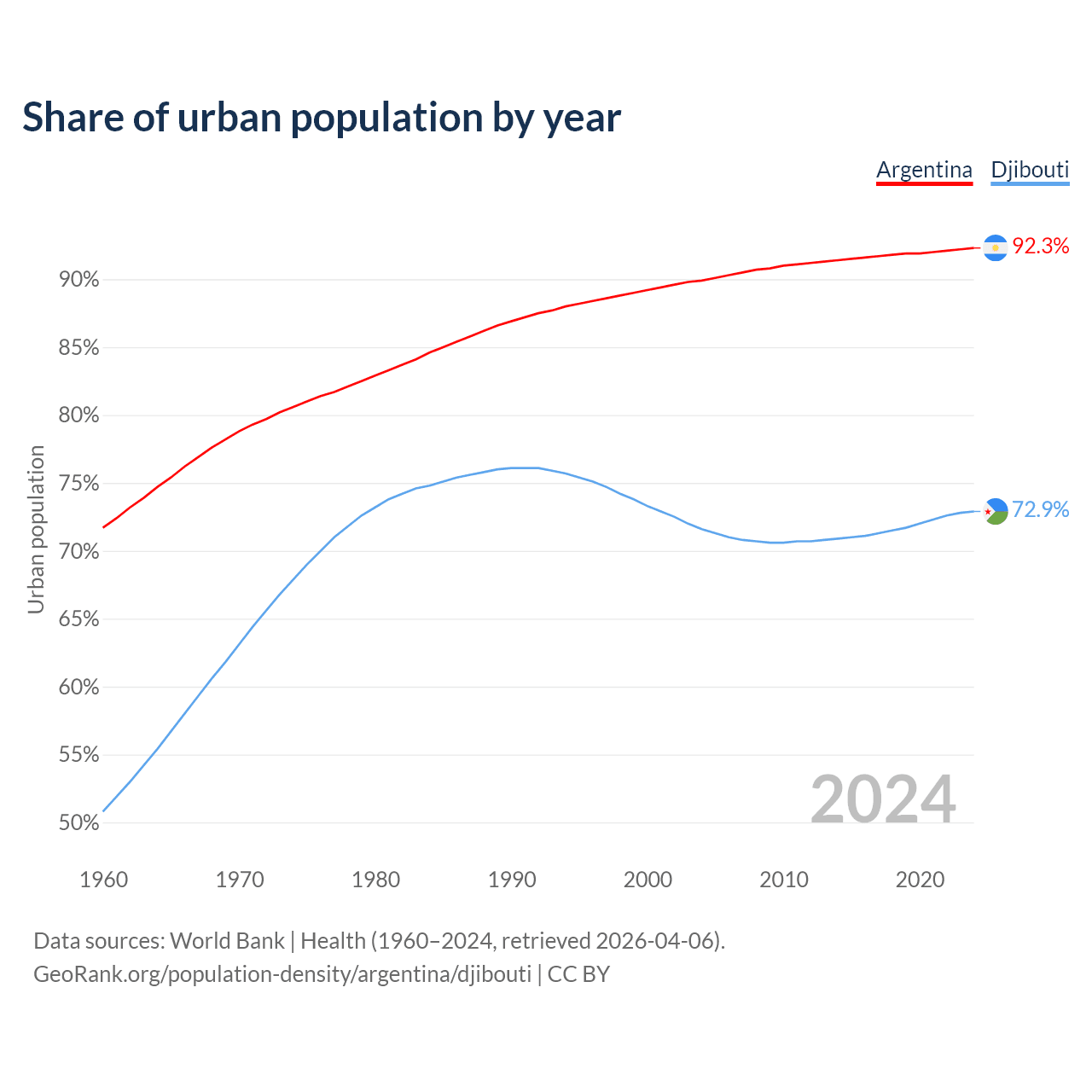 From 2004 to 2024, the share of urban population changed from 89.9% to 92.3% in Argentina and from 71.6% to 72.9% in Djibouti.