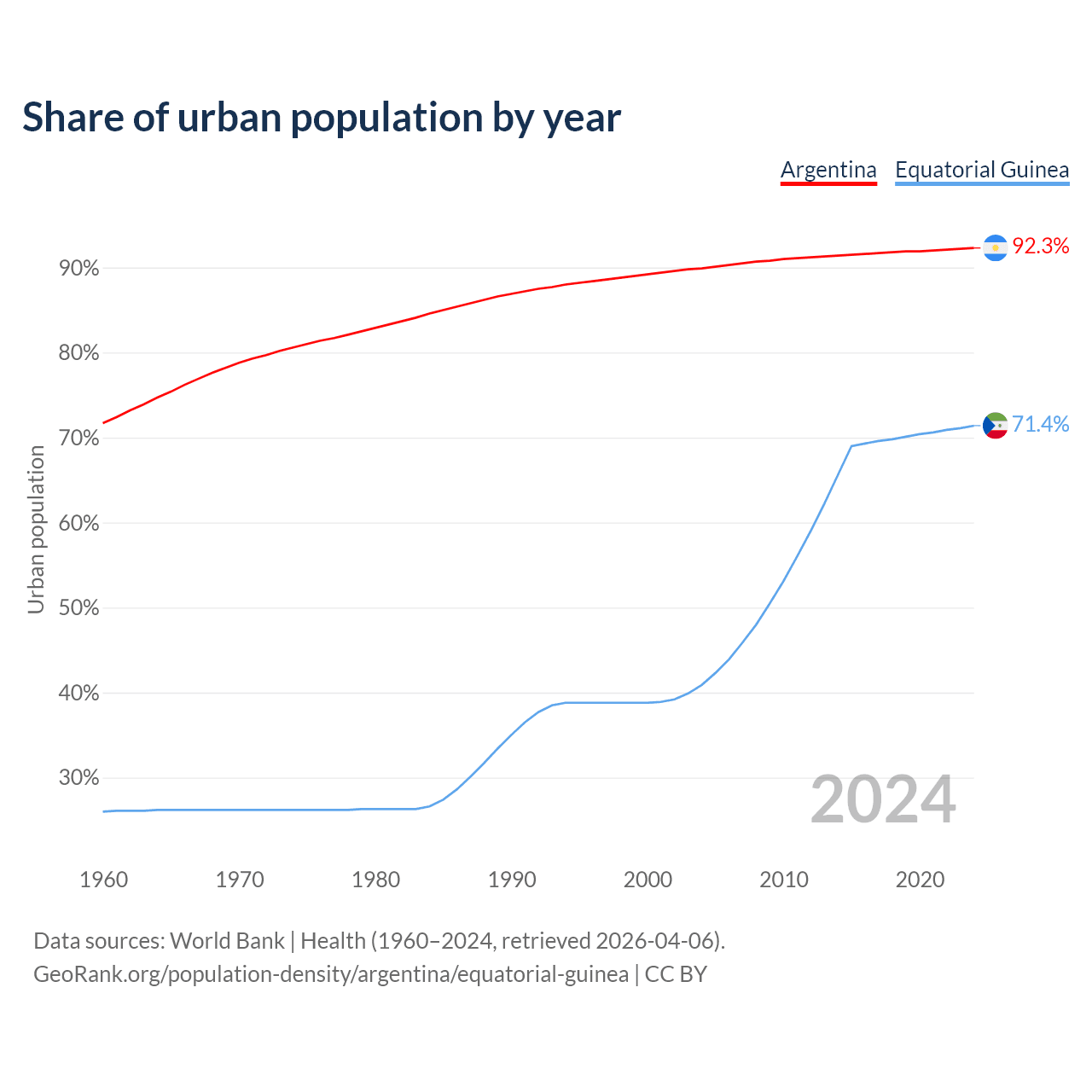 From 2004 to 2024, the share of urban population changed from 89.9% to 92.3% in Argentina and from 40.9% to 71.4% in Equatorial Guinea.