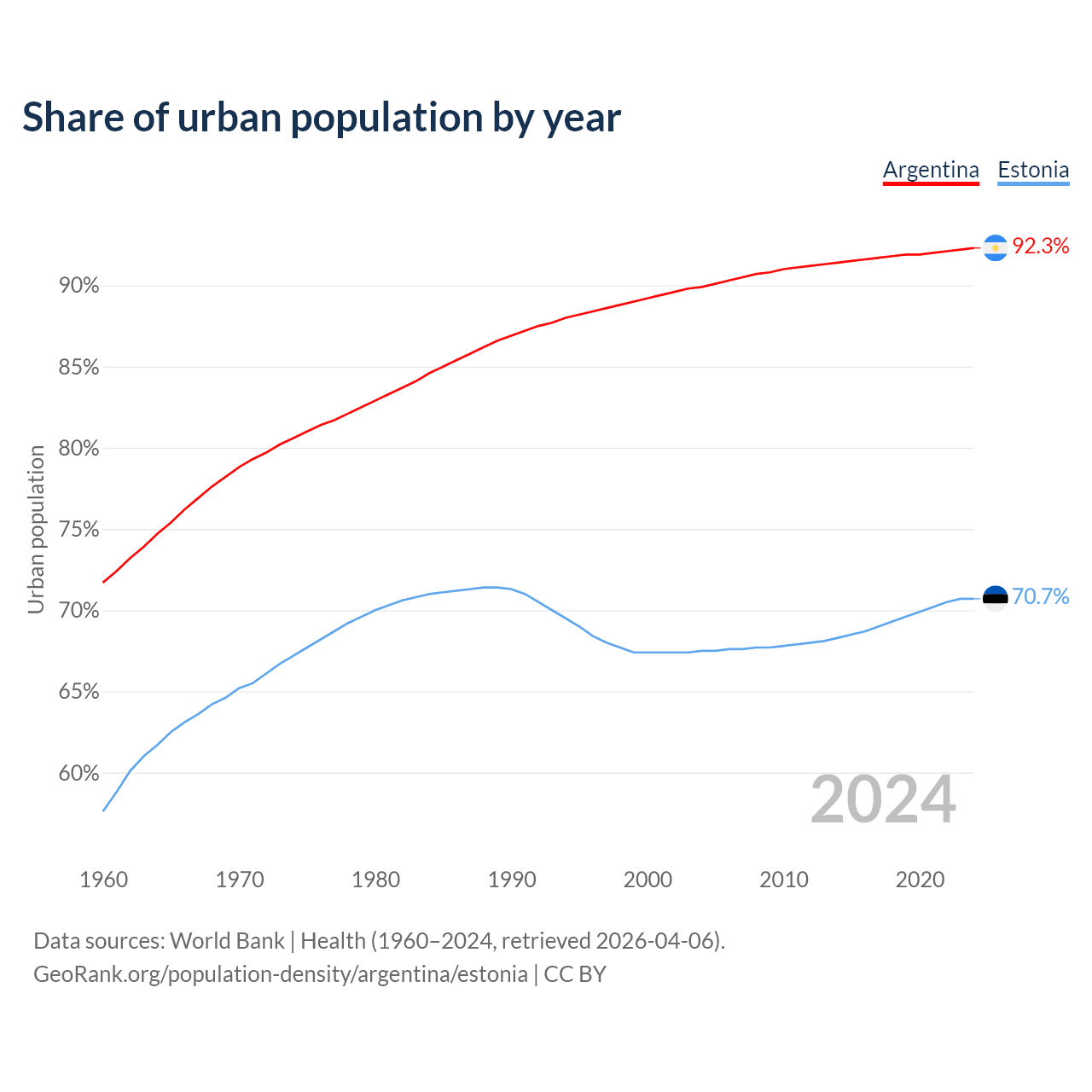 From 2004 to 2024, the share of urban population changed from 89.9% to 92.3% in Argentina and from 67.5% to 70.7% in Estonia.