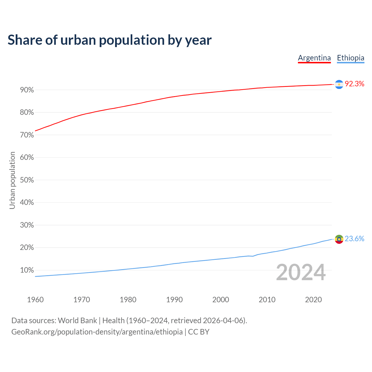From 2004 to 2024, the share of urban population changed from 89.9% to 92.3% in Argentina and from 15.8% to 23.6% in Ethiopia.