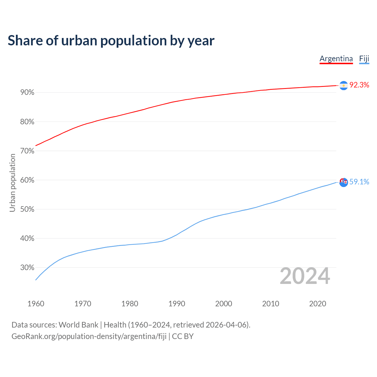 From 2004 to 2024, the share of urban population changed from 89.9% to 92.3% in Argentina and from 49.5% to 59.1% in Fiji.