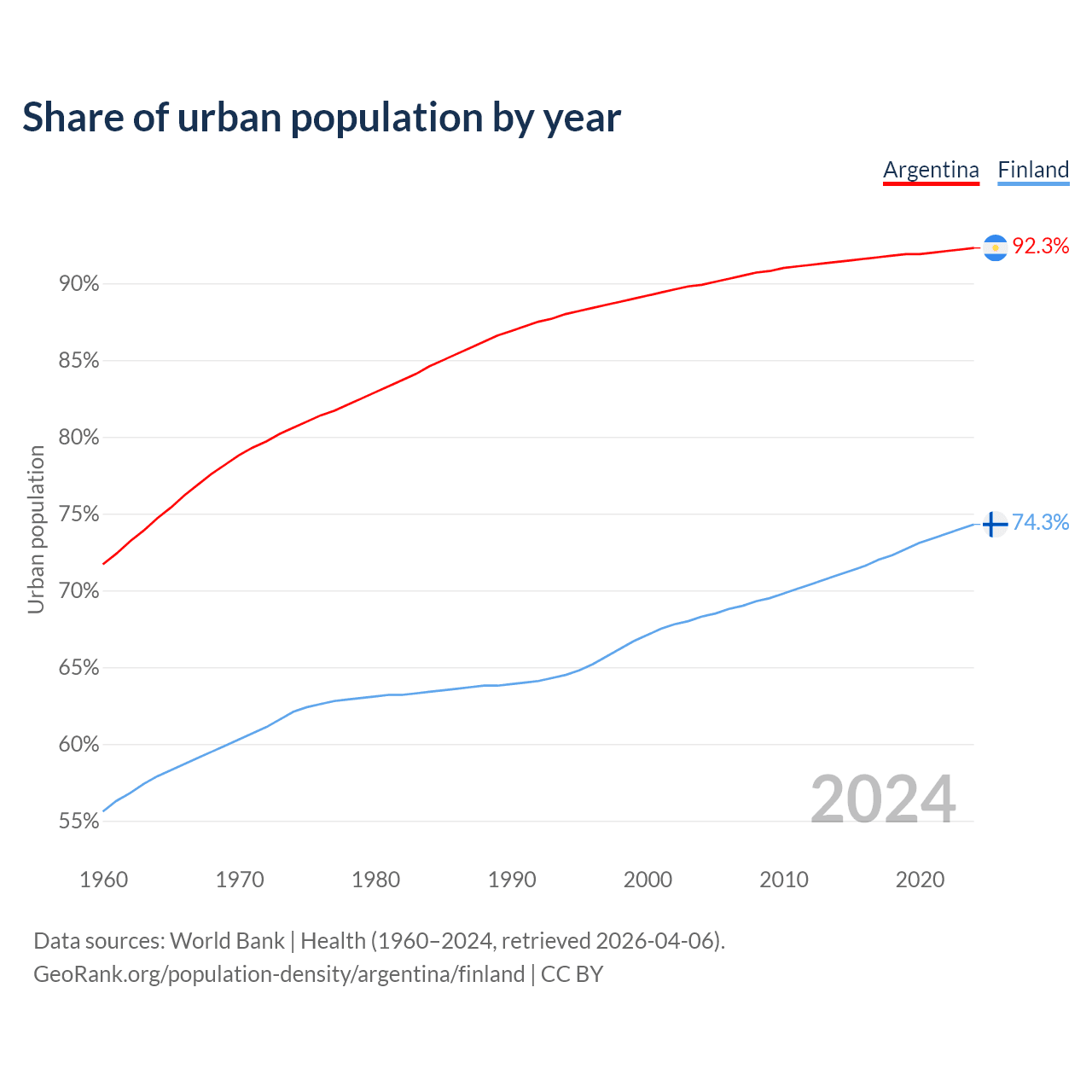 From 2004 to 2024, the share of urban population changed from 89.9% to 92.3% in Argentina and from 68.3% to 74.3% in Finland.