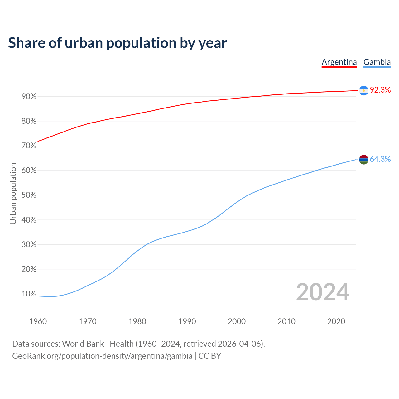 From 2004 to 2024, the share of urban population changed from 89.9% to 92.3% in Argentina and from 51.5% to 64.3% in the Gambia.