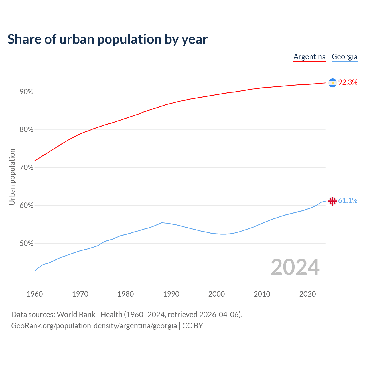 From 2004 to 2024, the share of urban population changed from 89.9% to 92.3% in Argentina and from 52.7% to 61.1% in Georgia.