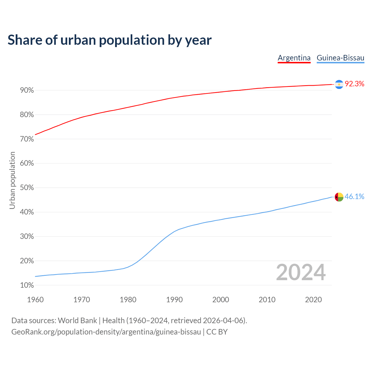 From 2004 to 2024, the share of urban population changed from 89.9% to 92.3% in Argentina and from 38.1% to 46.1% in Guinea-Bissau.