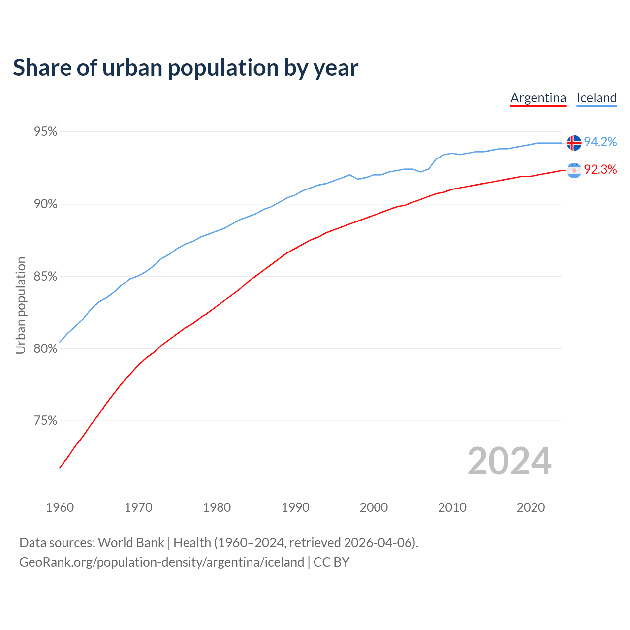 From 2004 to 2024, the share of urban population changed from 89.9% to 92.3% in Argentina and from 92.4% to 94.2% in Iceland.