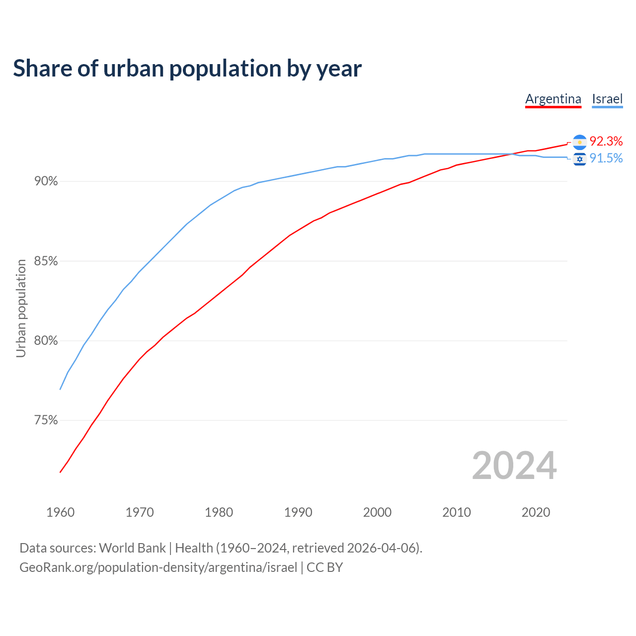 From 2004 to 2024, the share of urban population changed from 89.9% to 92.3% in Argentina and from 91.6% to 91.5% in Israel.