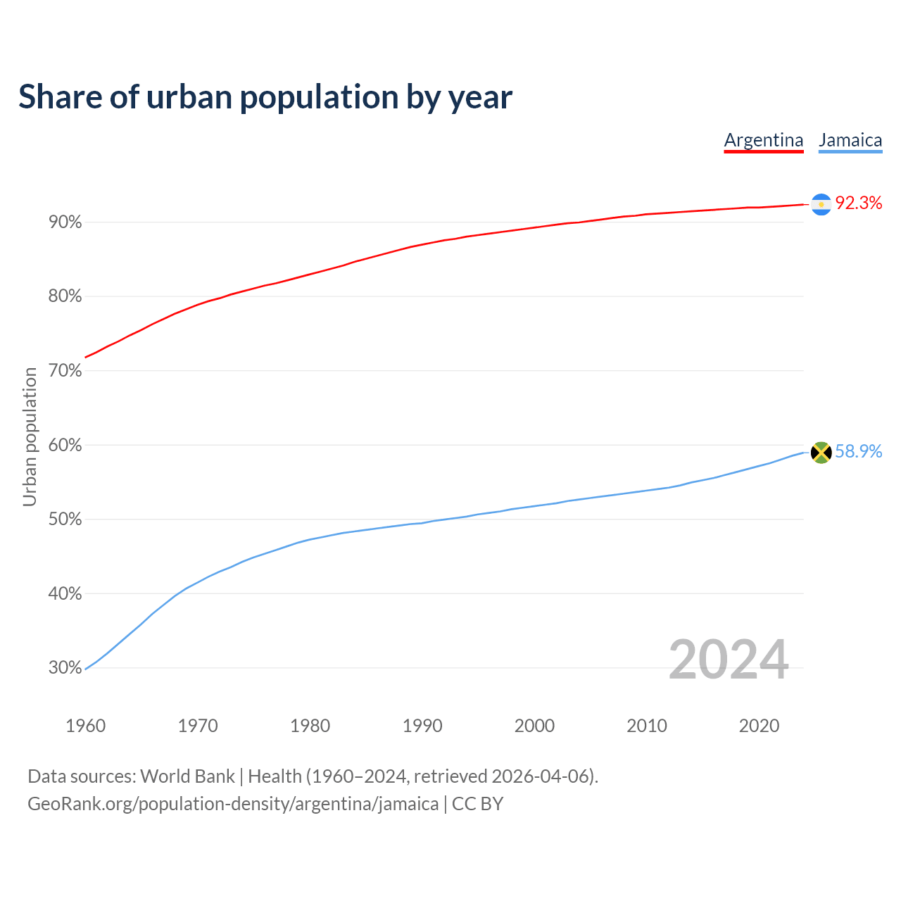 From 2004 to 2024, the share of urban population changed from 89.9% to 92.3% in Argentina and from 52.6% to 58.9% in Jamaica.