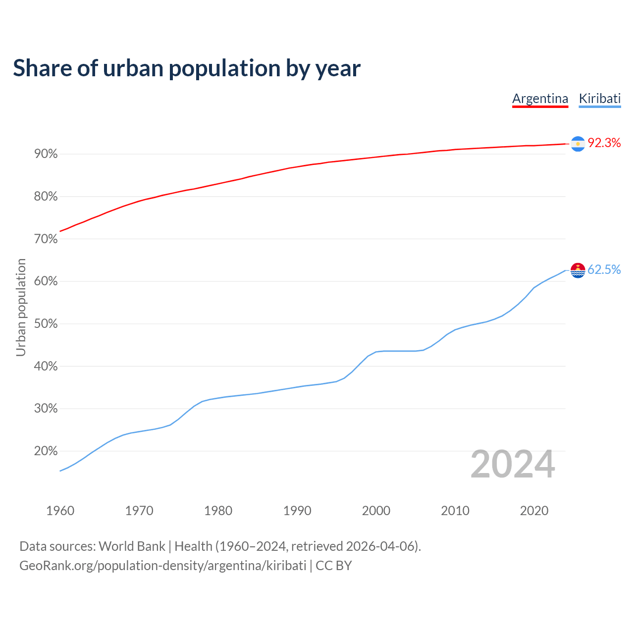 From 2004 to 2024, the share of urban population changed from 89.9% to 92.3% in Argentina and from 43.5% to 62.5% in Kiribati.