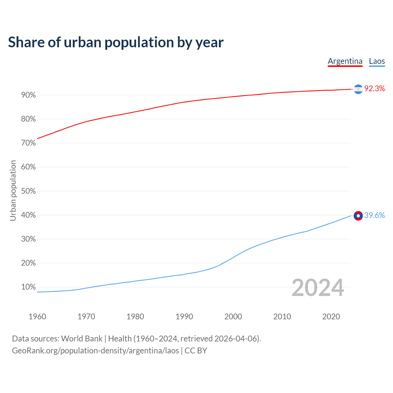 From 2004 to 2024, the share of urban population changed from 89.9% to 92.3% in Argentina and from 26.5% to 39.6% in Laos.
