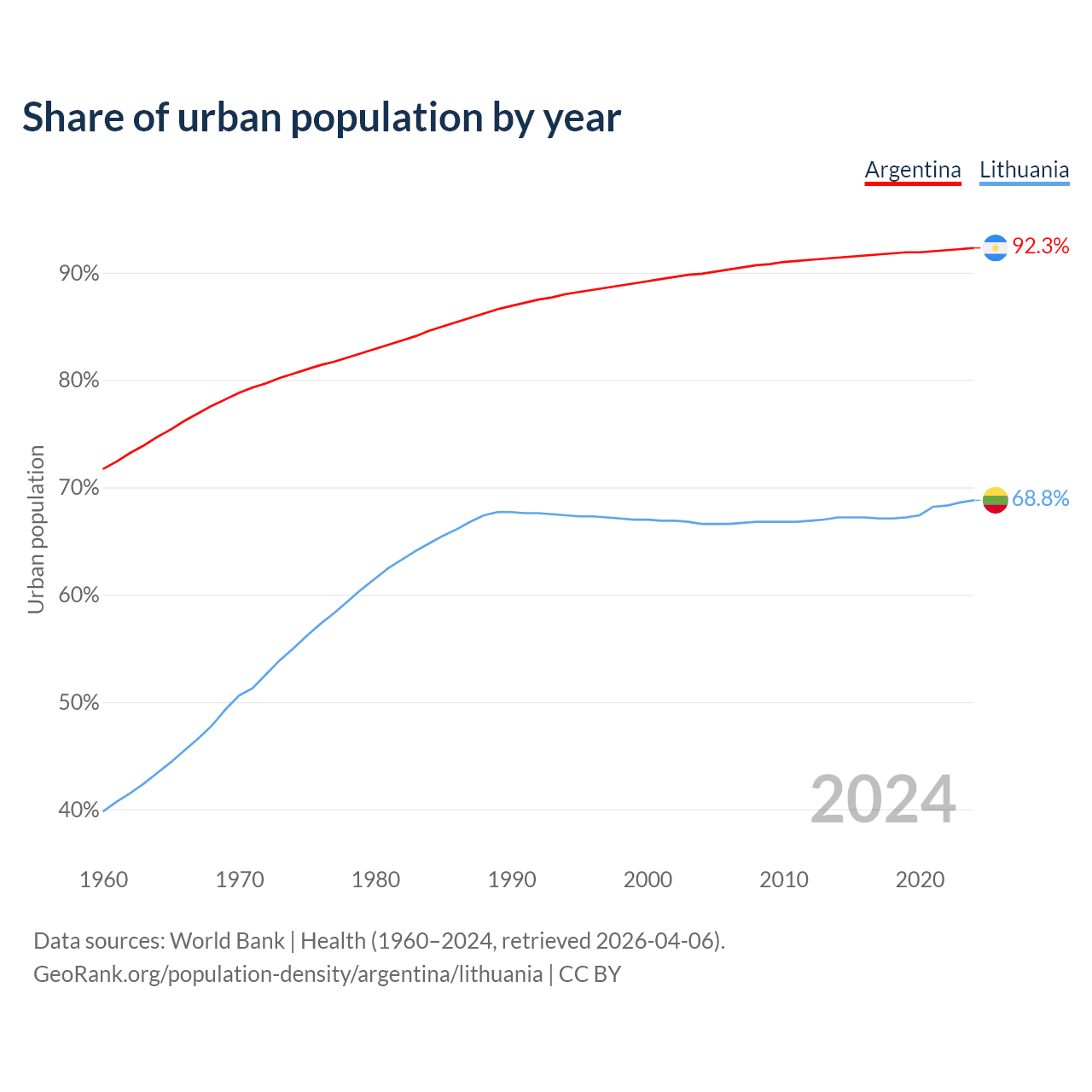 From 2004 to 2024, the share of urban population changed from 89.9% to 92.3% in Argentina and from 66.6% to 68.8% in Lithuania.