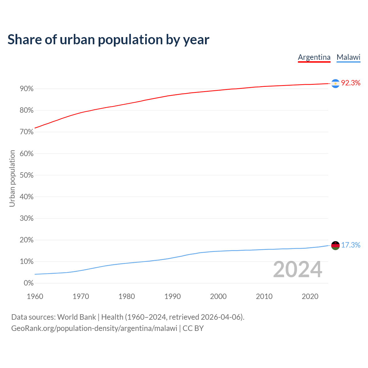 From 2004 to 2024, the share of urban population changed from 89.9% to 92.3% in Argentina and from 15% to 17.3% in Malawi.
