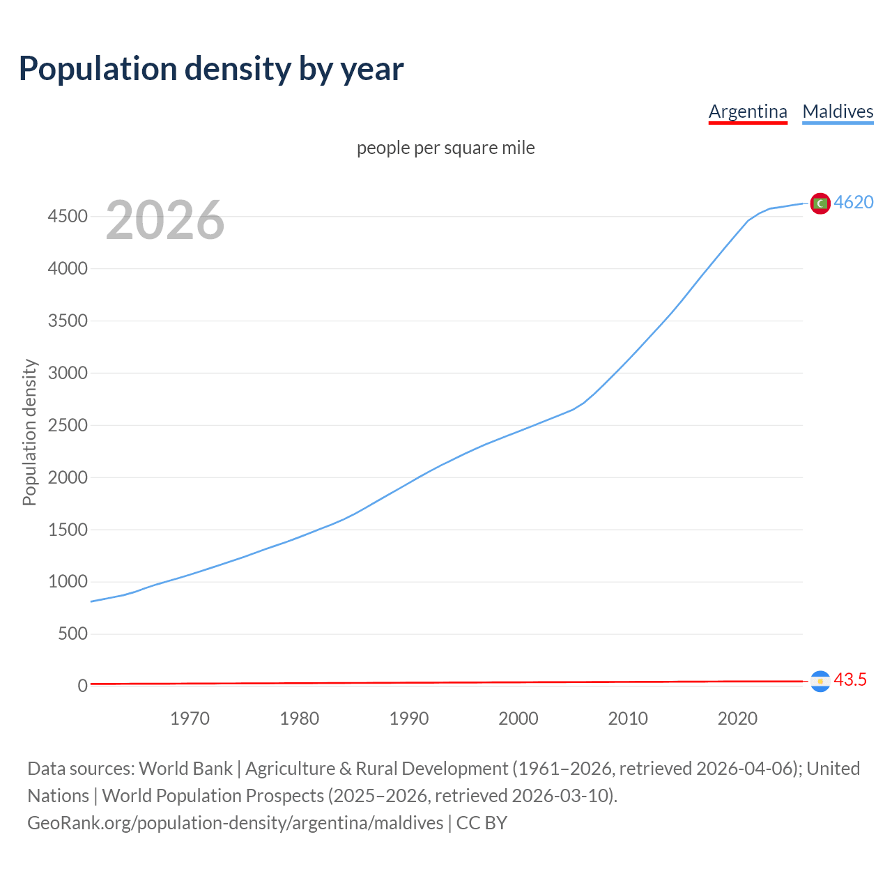 Argentina has a population density of 43.5 people per square mile compared to 4,620 people in Maldives. Argentina has 654,934 sq ft of land per person vs 6,077 sq ft in Maldives. Argentina and Maldives rank 180th and 6th by population density, respectively.