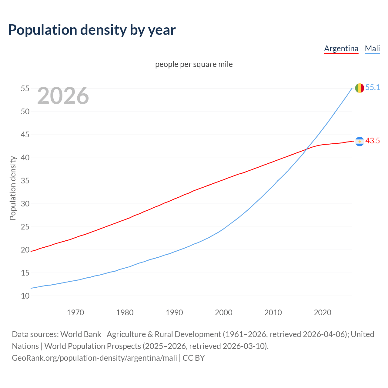 From 2006 to 2026, population density in Argentina increased by 16.1%, compared to a 85.4% growth in Mali.