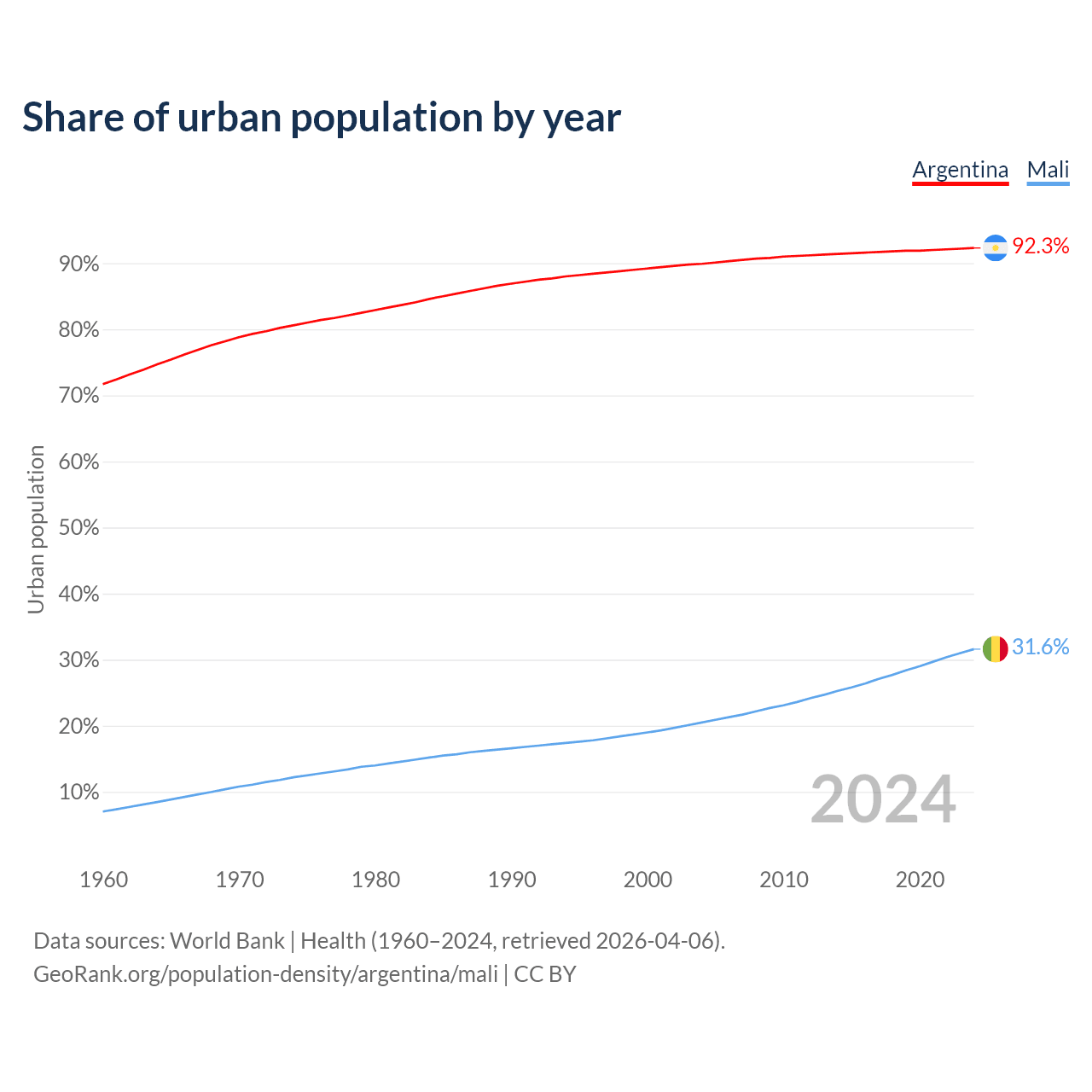 From 2004 to 2024, the share of urban population changed from 89.9% to 92.3% in Argentina and from 20.5% to 31.6% in Mali.