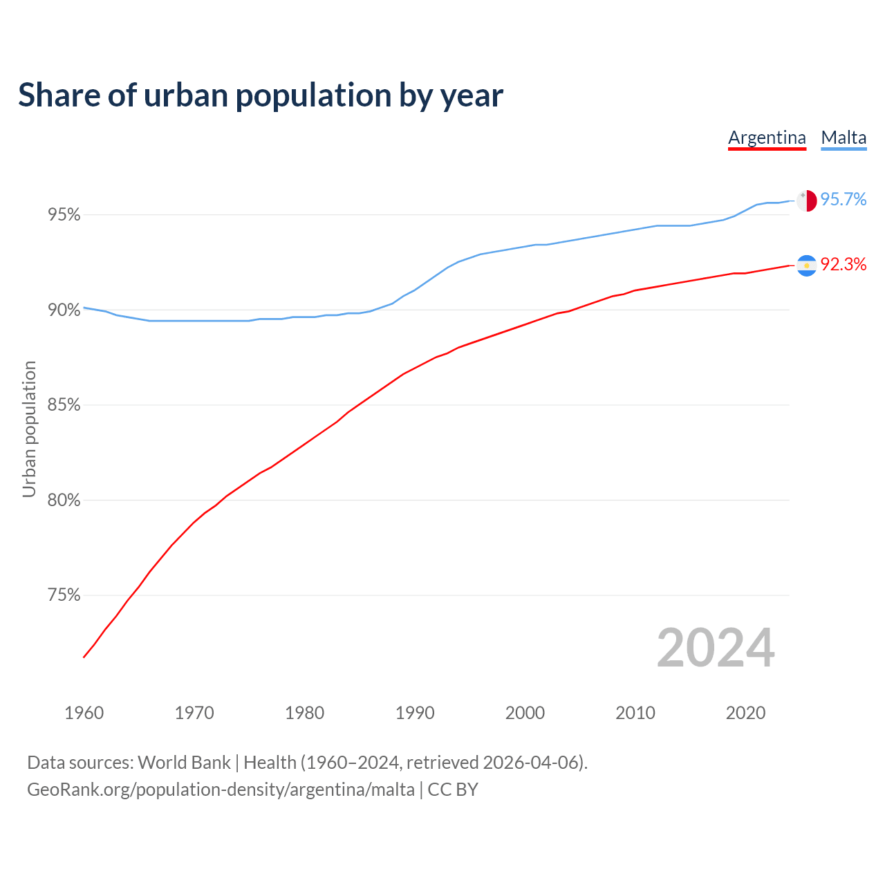 From 2004 to 2024, the share of urban population changed from 89.9% to 92.3% in Argentina and from 93.6% to 95.7% in Malta.