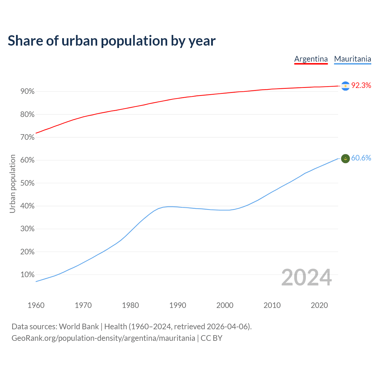 From 2004 to 2024, the share of urban population changed from 89.9% to 92.3% in Argentina and from 39.6% to 60.6% in Mauritania.