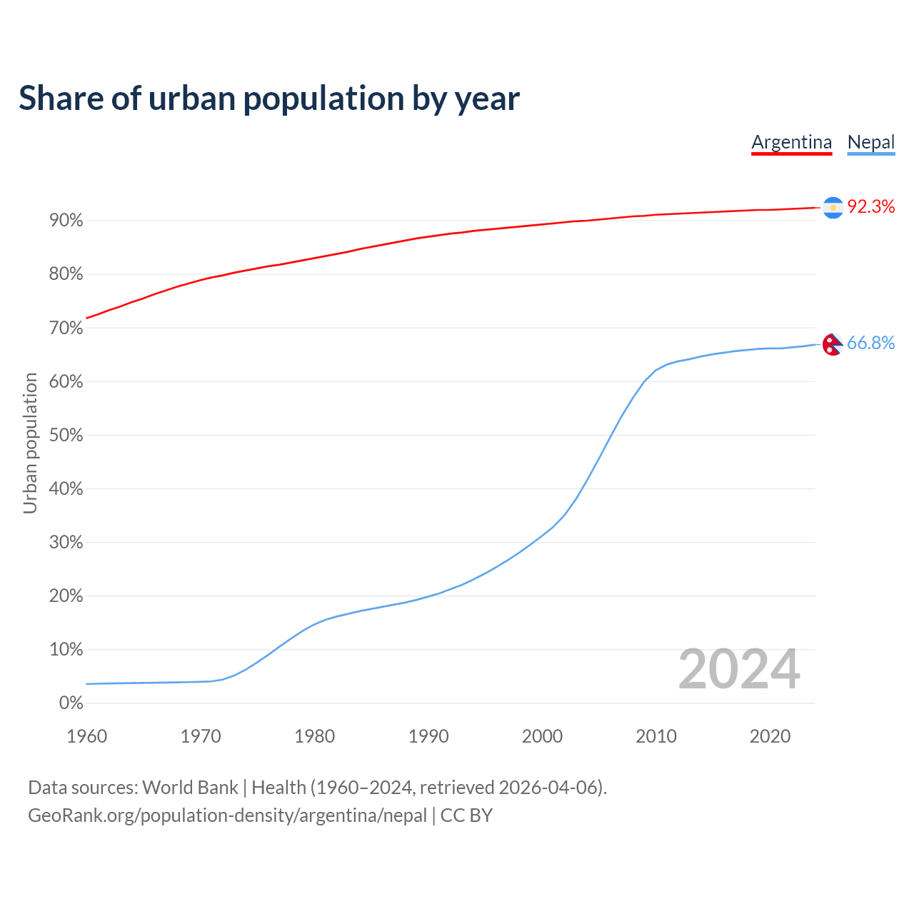 From 2004 to 2024, the share of urban population changed from 89.9% to 92.3% in Argentina and from 41.6% to 66.8% in Nepal.