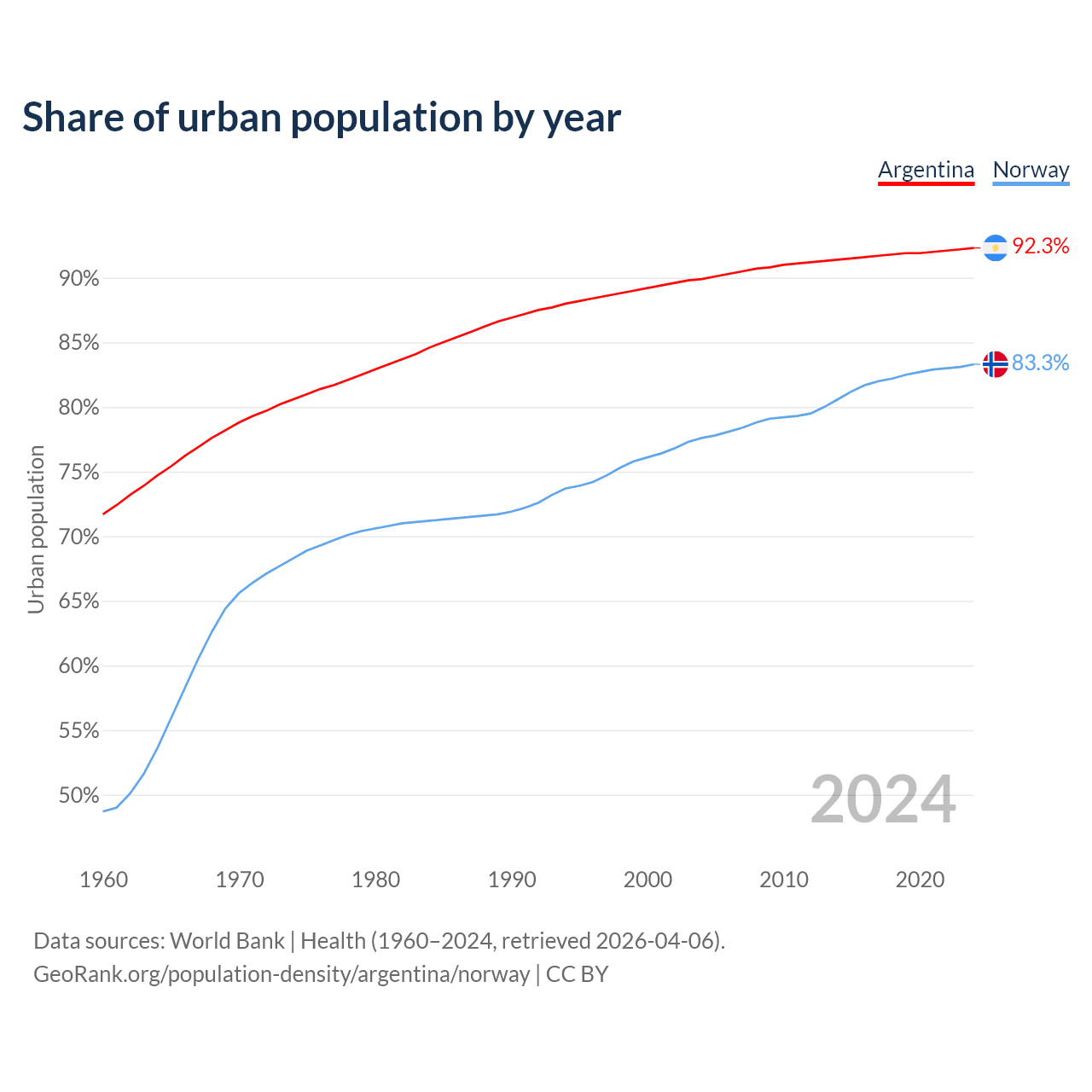 From 2004 to 2024, the share of urban population changed from 89.9% to 92.3% in Argentina and from 77.6% to 83.3% in Norway.