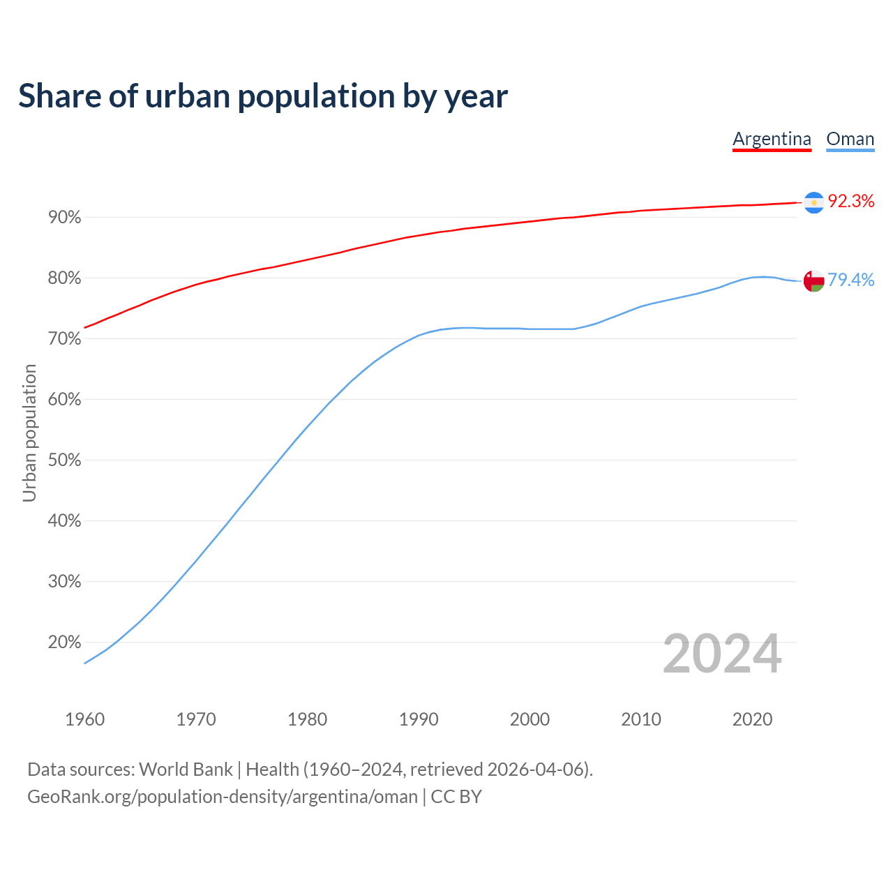 From 2004 to 2024, the share of urban population changed from 89.9% to 92.3% in Argentina and from 71.5% to 79.4% in Oman.