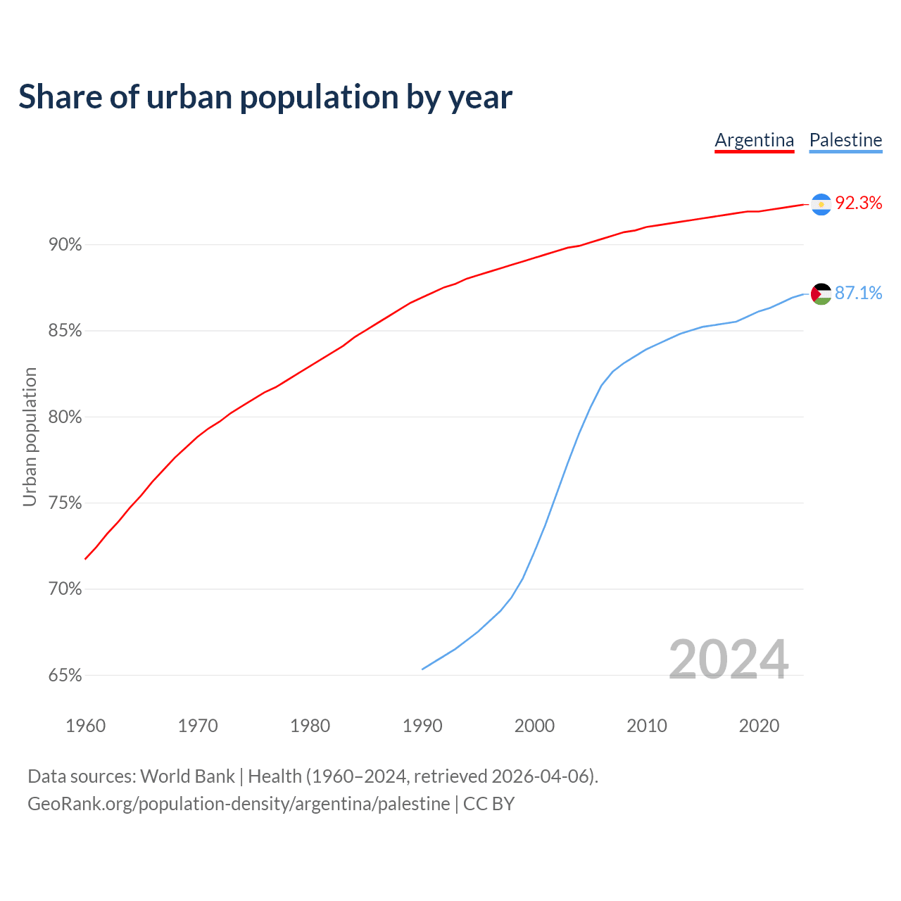 From 2004 to 2024, the share of urban population changed from 89.9% to 92.3% in Argentina and from 79% to 87.1% in Palestine.