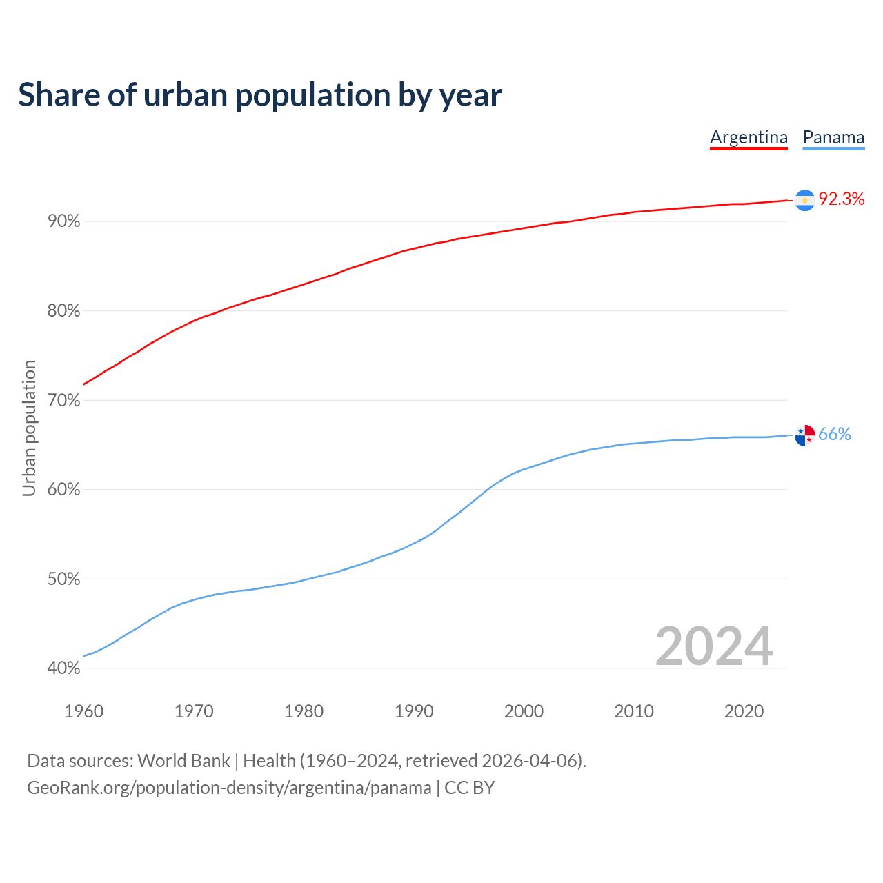 From 2004 to 2024, the share of urban population changed from 89.9% to 92.3% in Argentina and from 63.8% to 66% in Panama.